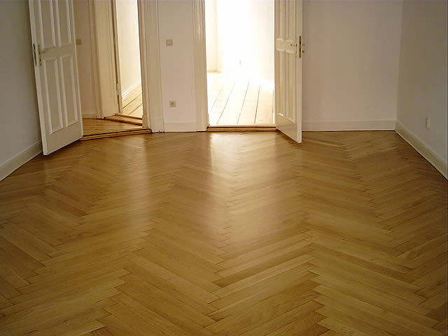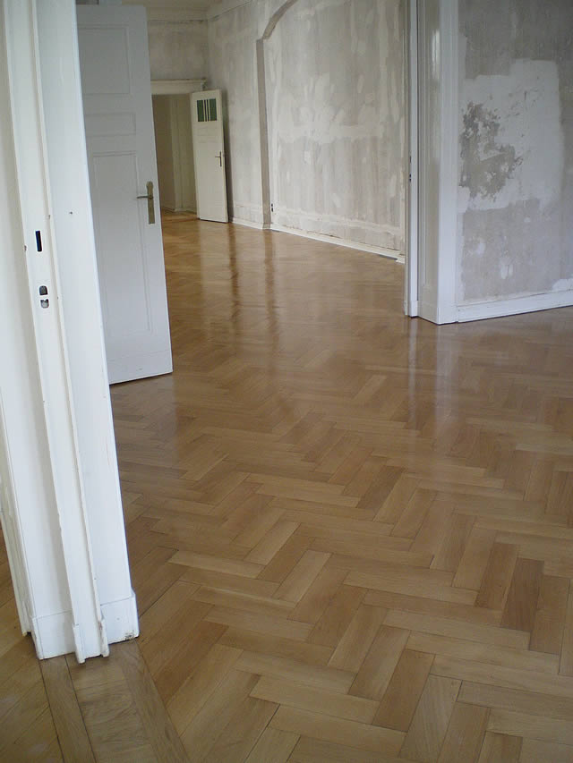 Altbau-Wohnung – Stabparkett Eiche Fischgrätverband, geschliffen und mit wasserbasiertem Parkettsiegel auf Basis von Polyurethan-/ Acryldispersionen dreifach seidenglänzend versiegelt
