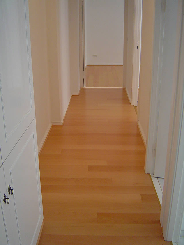 Altbau-Wohnung – Verlegung von Fertigparkett «Buche» im Schiffsverband, schwimmend mit Trittschalldämmung auf Verlegeplatten, anschließend Sockelleisten 6 cm Alt Berliner Profil weiss montiert.