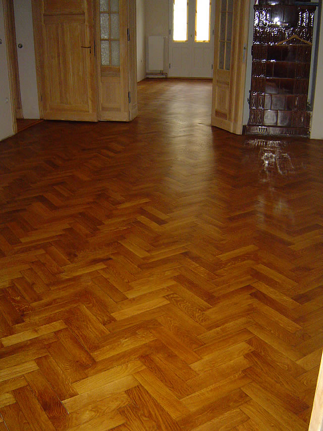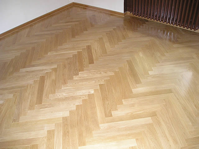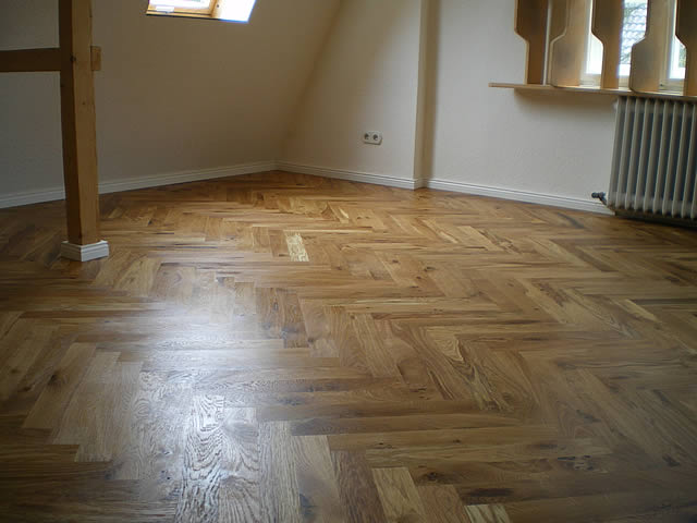 Stabparkett Eiche Fischgrätverband, geschliffen und versiegelt