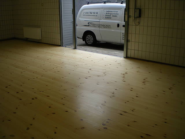 Verlegung von Kieferdielen, verdeckt geschraubt, geschliffen und versiegelt