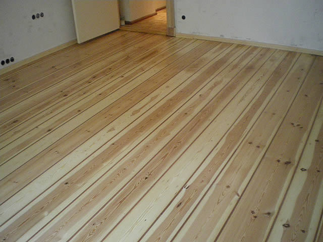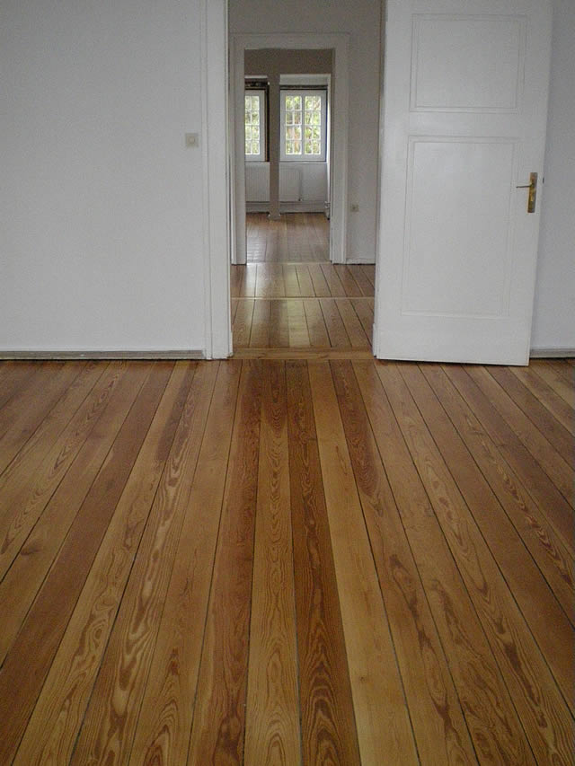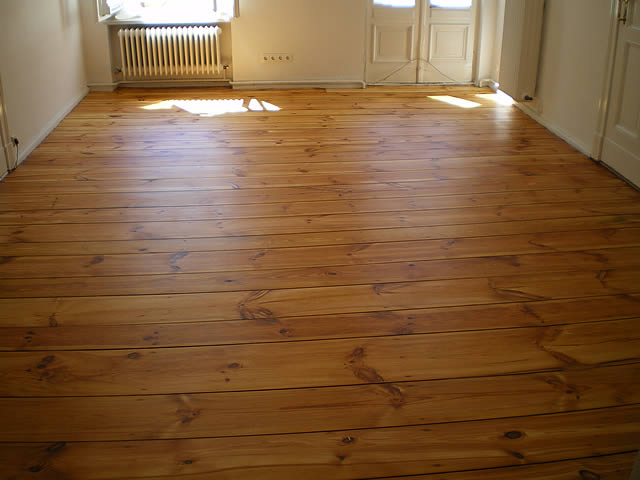 Altbau-Wohnung – Kieferdielen, Altbeläge entfernt, geschliffen und mit wasserbasiertem Parkettsiegel auf Basis von Polyurethan-/ Acryldispersionen dreifach versiegelt